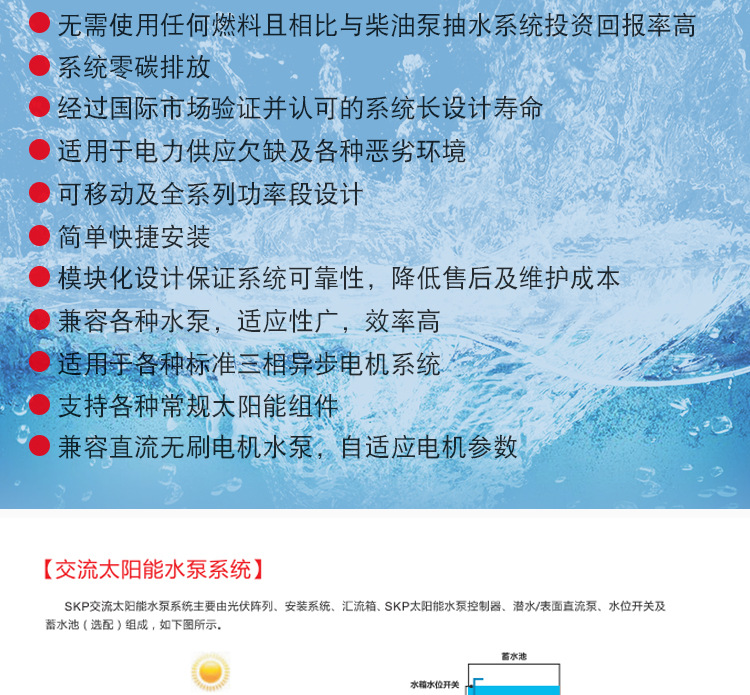 應用行業(yè):廣泛應用于陽光充足、市電短缺的地區(qū),可以解決農(nóng)場灌溉、畜牧養(yǎng)殖、生產(chǎn)生活的用水問題