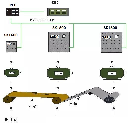 HMI作為操作工藝參數(shù)的輸入部分,是人機交互界面,通過輸入不同的參數(shù)來實現(xiàn)不同鋼材卷取要求。PLC作為控制器進行運算控制,協(xié)調(diào)各個變頻器工作。為了滿足高速響應(yīng)性,系統(tǒng)采用PLC和以及三科SKI600進行PROFIBUS-DP協(xié)議通信