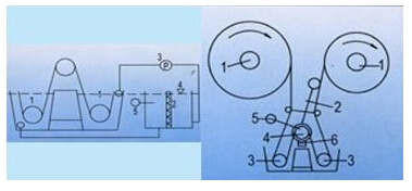 該卷染機(jī)的控制系統(tǒng)以三科變頻器作為控制器,采用觸摸屏作為人機(jī)界面,它們主要完成的是張力,線速度的設(shè)定,布的厚度的測(cè)量以及相關(guān)邏輯動(dòng)作的控制。變頻器和PLC之間采用485通訊。采用通訊方式的好處是可以隨時(shí)知道變頻器主要變量的信息,減少接線,使得整個(gè)系統(tǒng)看起來很精簡(jiǎn)。接線示意可見上圖。由圖中可見:兩臺(tái)完全一樣的變頻器,它們均工作于閉環(huán)矢量控制模式,由于卷染機(jī)在接近滿卷時(shí)候會(huì)較長(zhǎng)時(shí)間工作在很低的頻率下(1~3Hz),采用較高線數(shù)的編碼器有助于提高在低轉(zhuǎn)速工況下的控制性能,同時(shí)考慮散熱,需要采用變頻專用電機(jī)。