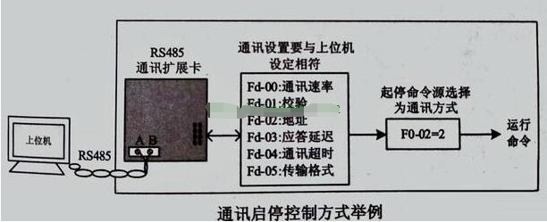 在VFD多功能擴(kuò)展口上,插入相應(yīng)的通信接口卡,選擇控制命令源作為通信模式(F0-02=2),這樣就可以通過(guò)通信模式控制VFD的啟動(dòng)和停止。通信相關(guān)功能代碼的設(shè)置如下圖所示。