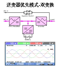 逆變器優(yōu)先運(yùn)行模式(雙變換)。如下圖示,從電氣變換技術(shù)角度來看,工頻機(jī)高頻機(jī)都是采用的雙變換在線式技術(shù),即能量經(jīng)過整流器逆變器兩次能量變換后,由逆變器提供電壓精度為1%、諧波含量小于5%的正弦波交流電給負(fù)載供電。這種運(yùn)行模式也可以稱為:逆變器優(yōu)先運(yùn)行模式(雙變換)。
