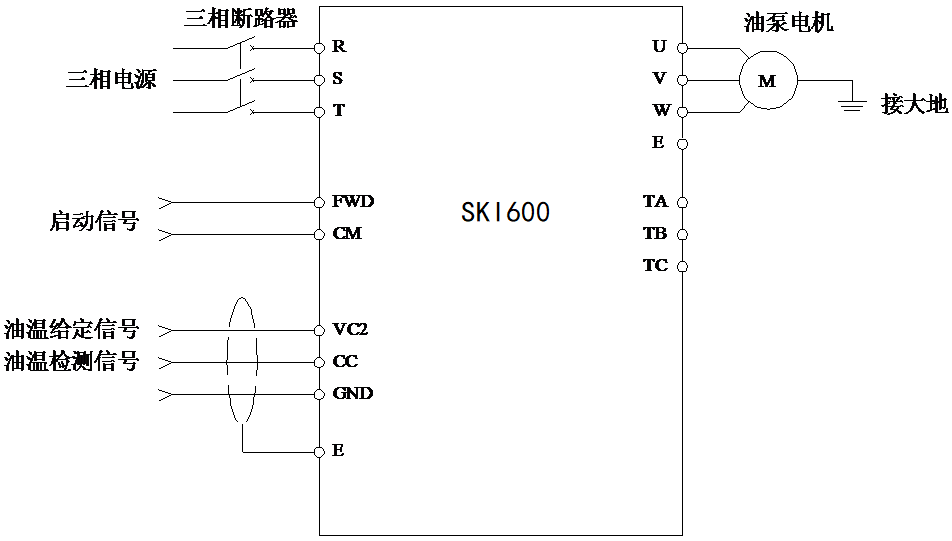 根據(jù)窯爐風(fēng)機(jī)系統(tǒng)控制的要求,采用三科SKI600通用重載變頻器來實(shí)現(xiàn)系統(tǒng)的全自動(dòng)溫度控制。即由溫度傳感器采集窯爐的當(dāng)前溫度,并通過模擬量通道反饋給變頻器,然后與設(shè)定的溫度值做比較,再由變頻器的PID控制器改變輸出頻率以調(diào)節(jié)風(fēng)機(jī)的轉(zhuǎn)速,進(jìn)而控制系統(tǒng)風(fēng)量,以保證系統(tǒng)的溫度控制精度及響應(yīng)性。其系統(tǒng)原理圖如下圖2所示: