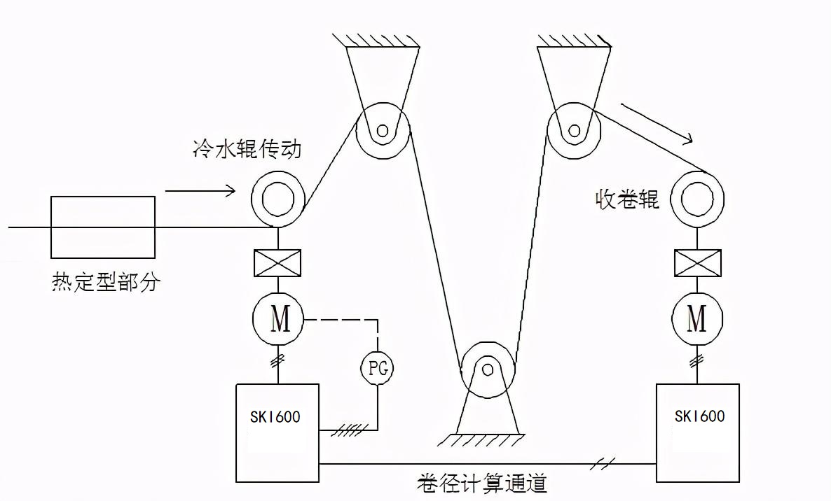 熱定型機卷取機前級為冷水輥,采用三分支SKI80高性能矢量控制變頻器和恒速控制。電機配有編碼器,編碼器利用冷水輥驅動器的速度反饋進行閉環(huán)控制。由卷繞控制的織物線速度由冷水輥變頻器的模擬輸出端口提供。卷筒空時直徑約200mm,滿時約1400mm,纏繞直徑變化7倍以上。在整個卷繞過程中,隨著卷繞直徑的增加,需要向卷繞電機提供更多的扭矩。卷筒采用三分支SKI600通用重型專用變頻器,中間安裝張力檢測輥作為斷線信號。