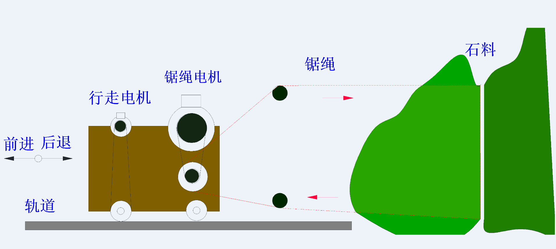作為開(kāi)山設(shè)備的繩鋸機(jī),通常是由兩臺(tái)電機(jī)驅(qū)動(dòng)的,其中大的是鋸繩電機(jī)帶動(dòng)鋸繩,鋸繩套在已鑿出縫隙的山體上高速運(yùn)行,而小的則是行走電機(jī),帶動(dòng)鋸床沿石頭被鋸開(kāi)的方向向后緩慢前進(jìn)??蓪?duì)較厚的混凝土實(shí)現(xiàn)各種切割,能保障橋梁、橋墩、碼頭平臺(tái)、水下混凝土樁的靜力切割拆除保證原結(jié)構(gòu)不受損壞。