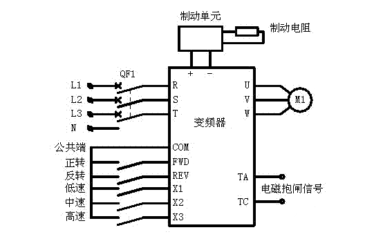 提升機傳統(tǒng)的操作方式為,操作工人坐在煤礦井口操作臺前,手握操縱桿控制電機正﹑反轉(zhuǎn)個三擋速度。為適應(yīng)操作工人這種操作方式,采用多段速度設(shè)置,F(xiàn)WD、REV設(shè)為正反轉(zhuǎn),X1、X2、X3設(shè)為低、中、高三擋速度。變頻調(diào)速原理圖如下圖所示。