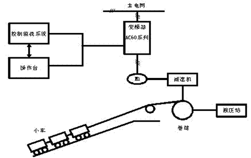 礦井提升機是煤礦,有色金屬礦生產(chǎn)過程中的重要設(shè)備。提升機的安全、可靠運行,直接關(guān)系到企業(yè)的生產(chǎn)狀況和經(jīng)濟效益。山西某煤礦井下采煤,采好的煤通過斜井用提升機將煤車拖到地面上來。這種拖動系統(tǒng)要求電機頻繁的正、反轉(zhuǎn)起動,減速制動,而且電機的轉(zhuǎn)速一定規(guī)律變化。斜井提升機的機械結(jié)構(gòu)示意如下圖所示。斜井提升機的動力由繞線式電機提供,采用轉(zhuǎn)子串電阻調(diào)速。